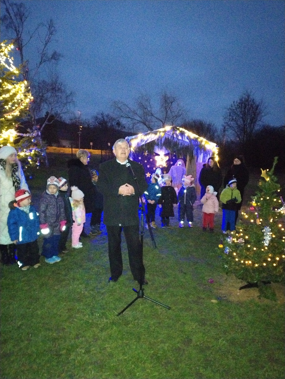 A feldíszített karácsonyfa, a Betlehemi jászol és az adventi koszorú méltó keretet biztosított a gyertya gyújtáshoz.