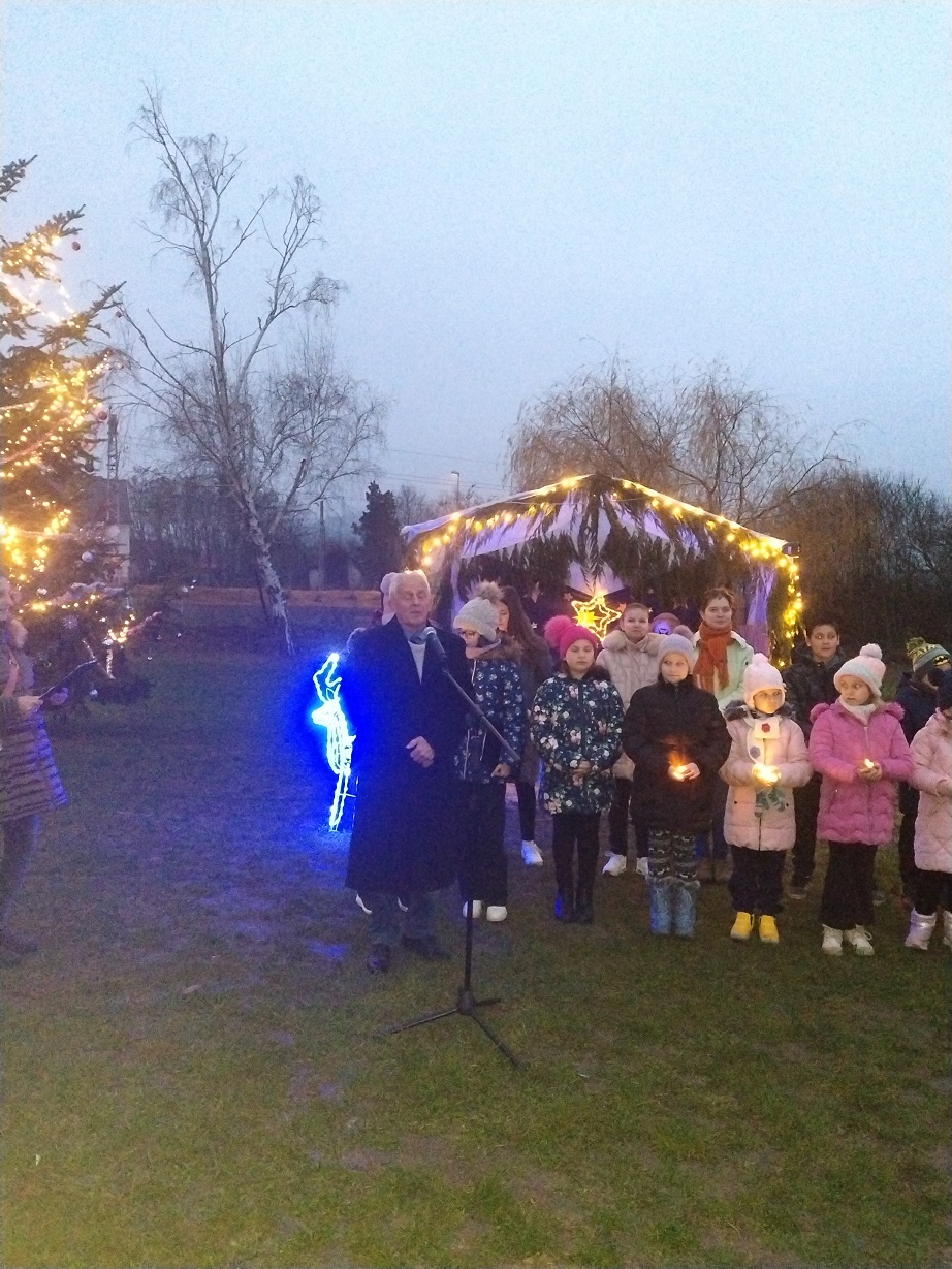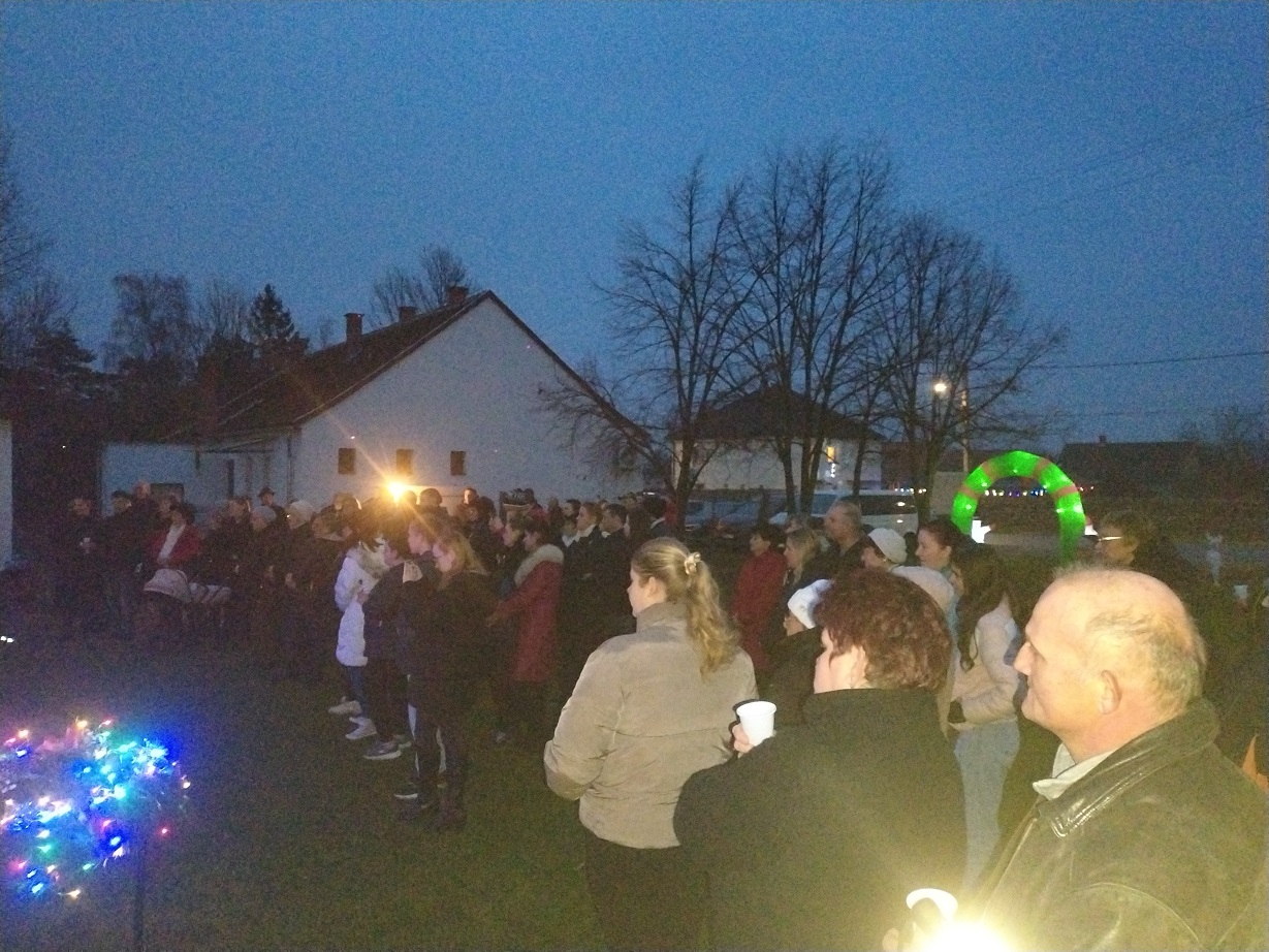 A feldíszített karácsonyfa, a Betlehemi jászol és az adventi koszorú méltó keretet biztosított a gyertya gyújtáshoz.