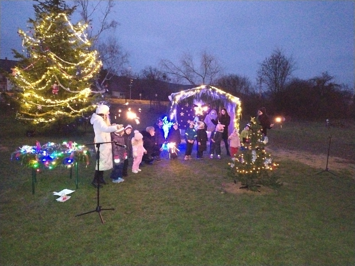 A feldíszített karácsonyfa, a Betlehemi jászol és az adventi koszorú méltó keretet biztosított a gyertya gyújtáshoz.