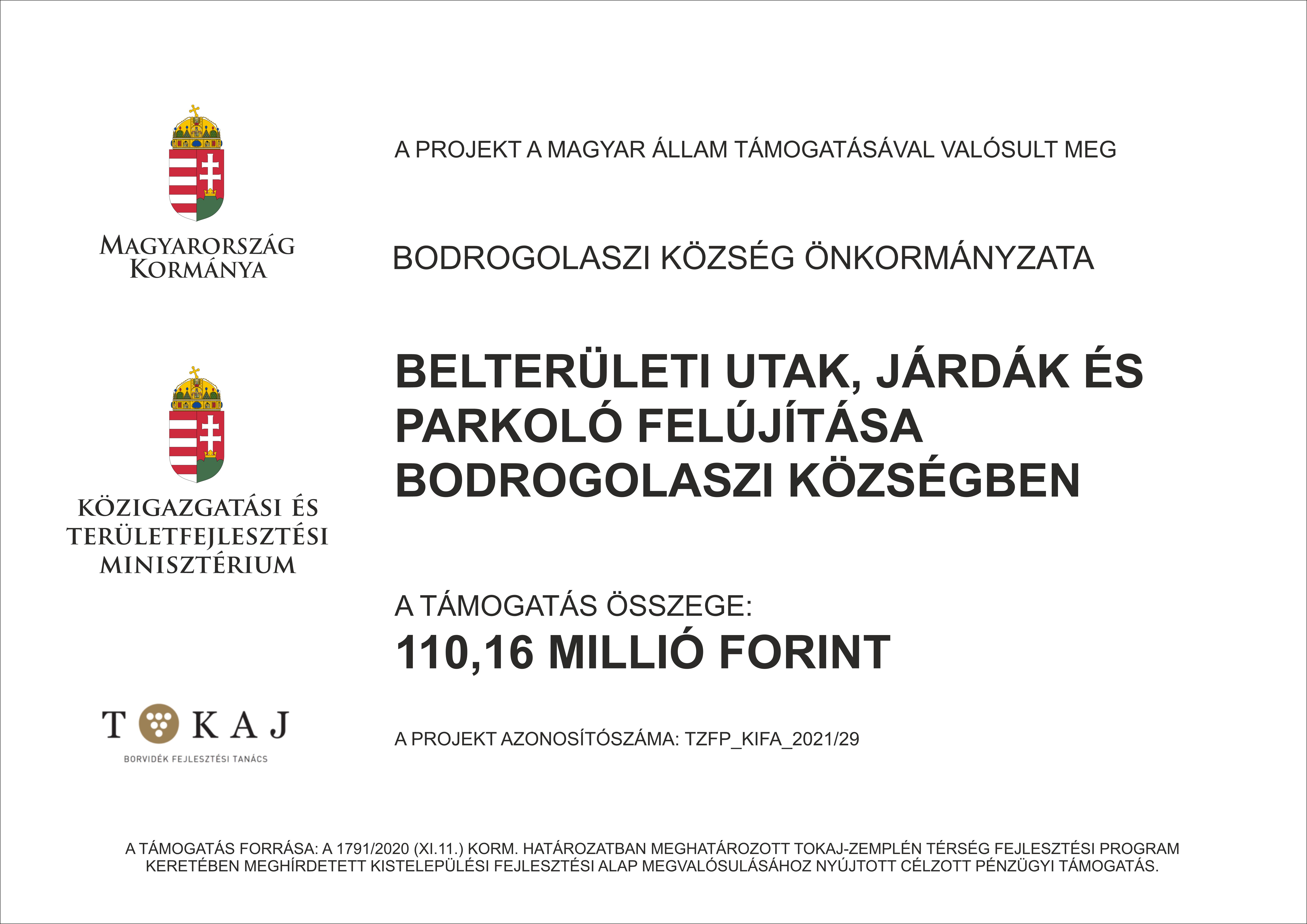 - Kategória: TOP-2.1.3-16-BO1-2021-00096 sz., Települési infrastruktúra fejlesztések Bodrogolasziban